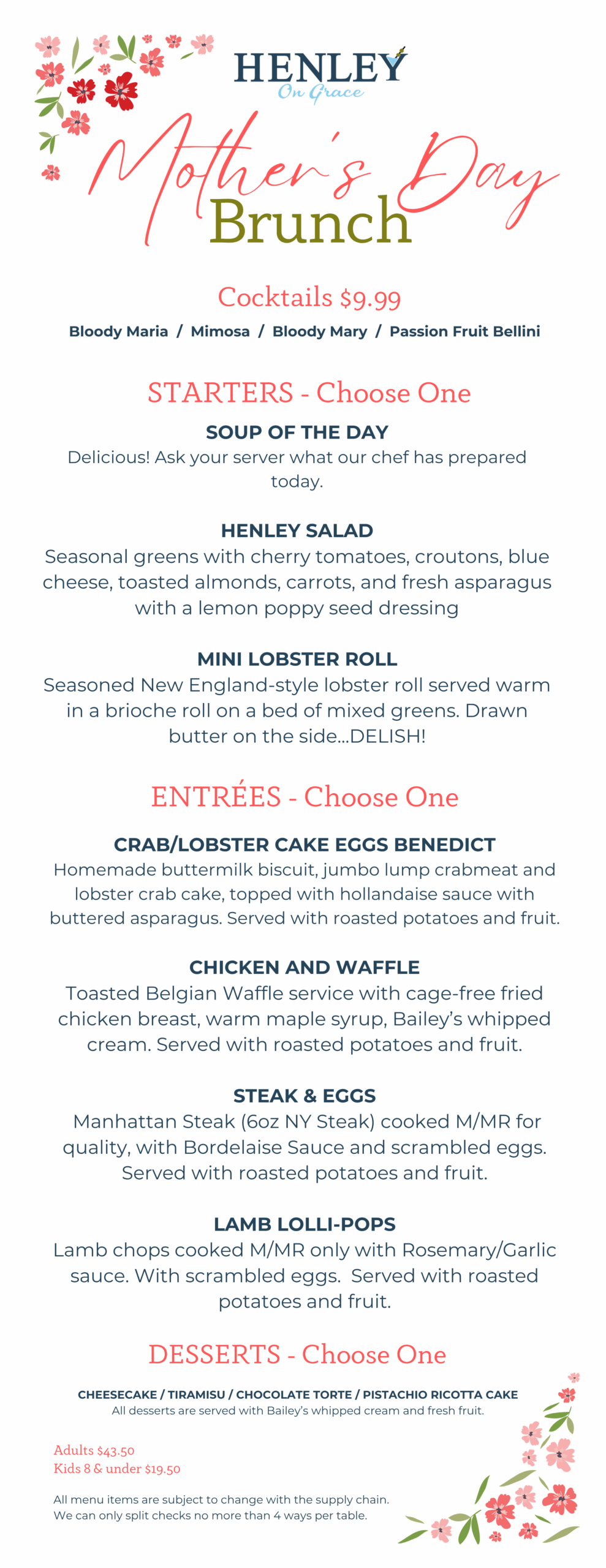 Henley on Grace is delighted to host Mother’s Day Brunch for Mom and the family.